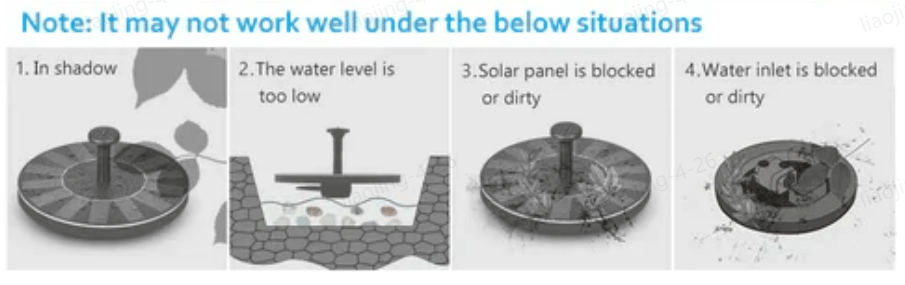 - Usage advice: Make sure you have poured enough water into the basin so that the pump can fall completely underwater. You should clean the pump regularly to avoid clogging with dust. The solar panel needs to be kept clean, and the shading of leaves or stains will affect the conversion of solar energy.. It does not store any energy, so it will rest at night to ensure a longer life.
